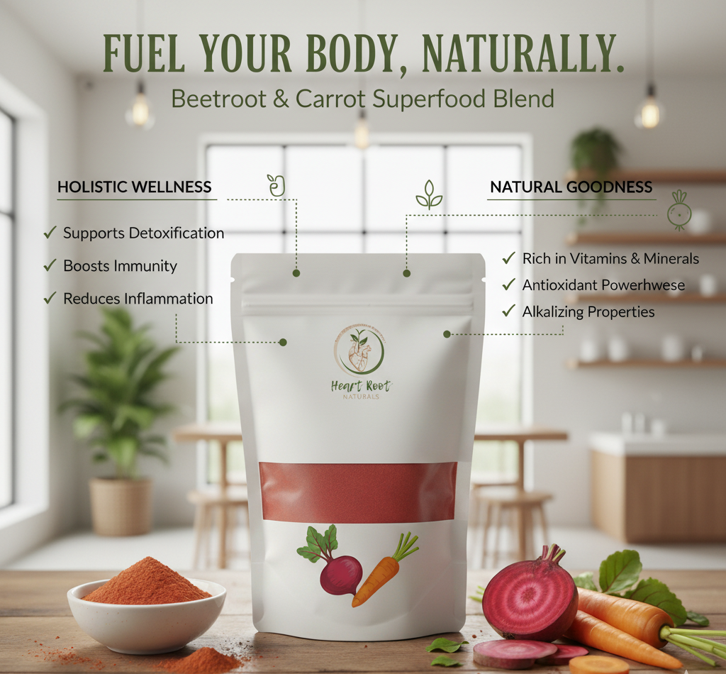 Natural beetroot & carrot powder for heart health, energy & glowing skin. Rich in iron, antioxidants & beta-carotene. Pure wellness from Heart Root Naturals.